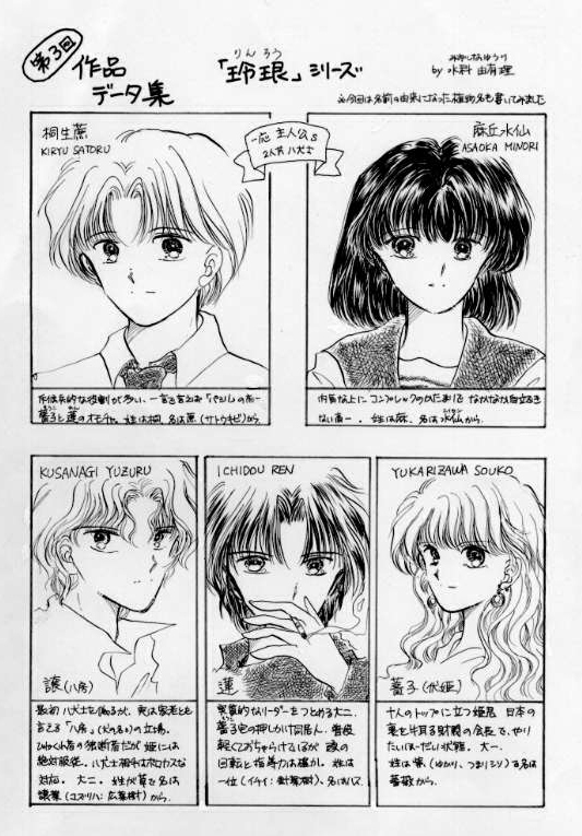 某オリキャラおひろめサークル用に描いたもの。「作品データ集」コーナーで ご指名頂いたのでした。何度か出てるものですが「玲琅(りんろう)シリーズ」より。 それぞれの絵をクリックしていただければ、多分文字が読める程度には拡大 されたものが出ますが、ファイルサイズがやたらデカいのでご注意ください。